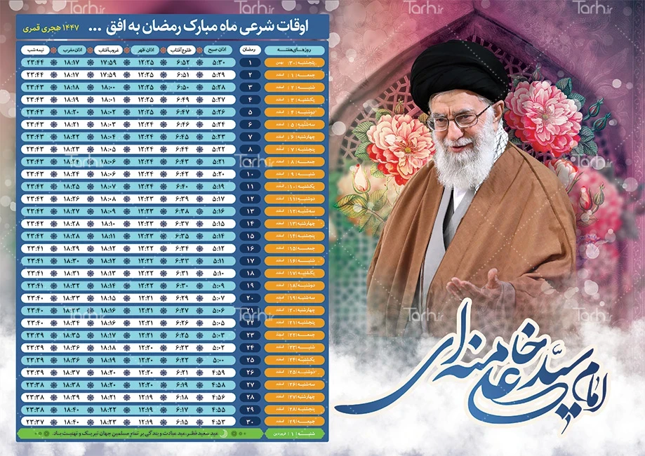 طرح تراکت لایه باز اوقات شرعی ماه رمضان با عکس رهبری کد فایل 5712306