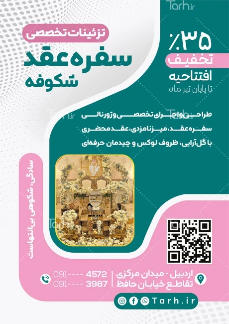 ابعاد طرح تراکت تبلیغاتی سفره عقد در جدول ویژگیهای فایل درجشده و با توجه به لایه باز بودن و کیفیت بالای طرح سفره آرایی، قابلیت ویرایش و تبدیل به سایز دلخواه، همچنین چاپ روی متریالهای مختلف مانند بنر، کاغذ، گلاسه و ... را دارا میباشد. برای مثال تراکت خام سفره آرایی در ابعاد A4 رزولوشن 300 dpi قابلیت چاپ بنر و لارج فرمت در ابعاد بزرگتر مانند 3 در 4 متر و بدون افت کیفیت را دارا میباشد. تراکت ها به عنوان یک ابزار تبلیغاتی بسیار موثر محسوب می شوند و به دلیل هزینه کم و تأثیر بالا، در بسیاری از کسب و کارها به عنوان روشی برای تبلیغات و رویدادهای مختلف مورد استفاده قرار می گیرند.
