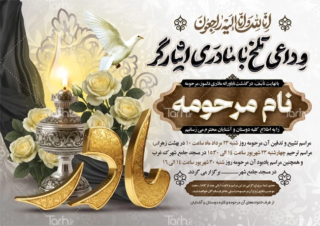 فایل اعلامیه فوت مادر با فرمت psd و قابل ویرایش در نرمافزار فتوشاپ بهصورت لایه باز توسط تیم طراحان طرح دات آی آر طراحی شده است. در فایل اعلامیه ترحیم مادر از تصاویر و المانهای باکیفیت و متناسب با استاندارد چاپ استفادهشده، همچنین نکات مهم در طرح آگهی ترحیم مادر مانند رنگبندی، رعایت حاشیه، فاصلهها، فضای کافی برای درج متن، سایز و نوع فونت مناسب طراحی آگهی ترحیم و ... رعایت گردیده است. طرح لایه باز آگهی فوت مادر شامل تایپوگرافی در وداعی تلخ با مادری ایثارگر، خوشنویسی مادر، انا لله و انا الیه راجعون میباشد که المانهای استفادهشده در آگهی ترحیم لایه باز مادر قابلیت ویرایش، جابهجایی و تغییر سایز را دارا بوده و شما میتوانید متناسب باسلیقه خودتان نمونه اعلامیه ترحیم مادر را ویرایش نمایید.
