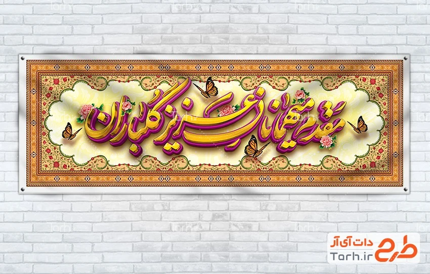 طرح لایه باز پلاکارد خیر مقدم میهمانان با خوشنویسی مقدم میهمانان عزیز گلباران کد فایل 5791408