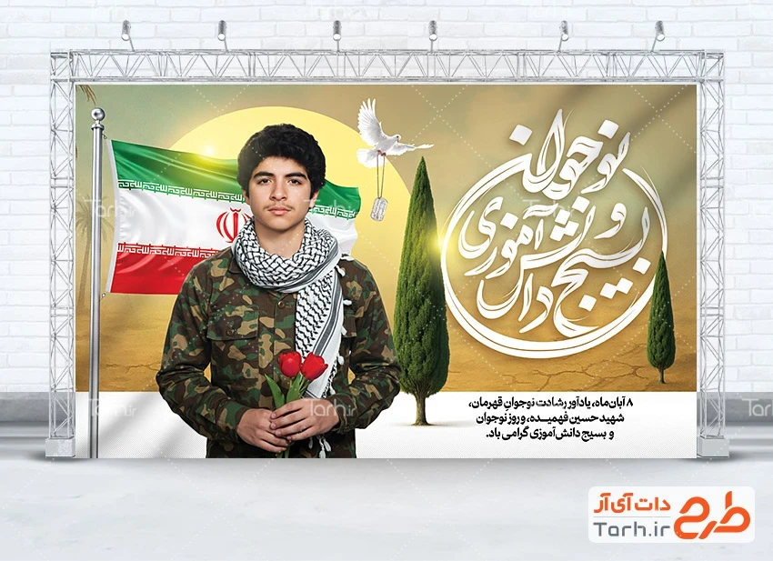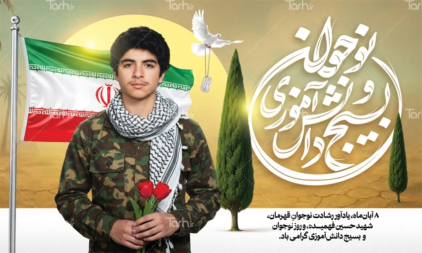 بنر لایه باز روز نوجوان و بسیج دانش آموزی با فرمت psd و قابل ویرایش در نرم افزار فتوشاپ به صورت لایه باز توسط تیم طراحان طرح دات آی آر طراحی شده است. در طرح بنر شهید حسین فهمیده و روز نوجوان از تصاویر و المان های با کیفیت و متناسب با استاندارد چاپ استفاده گردیده است. پوستر هفته بسیج دانش آموزی شامل تایپوگرافی نوجوان و بسیج دانش آموزی و عکس شهید حسین فهمیده و عکس پرچم ایران می باشد که المان های استفاده شده در طرح لایه باز بنر هفته بسیج دانش آموزی قابلیت ویرایش، جابه جایی و تغییر سایز را دارا بوده و شما می توانید متناسب با سلیقه خودتان طرح روز بسیج دانش آموزی را ویرایش نمایید.
