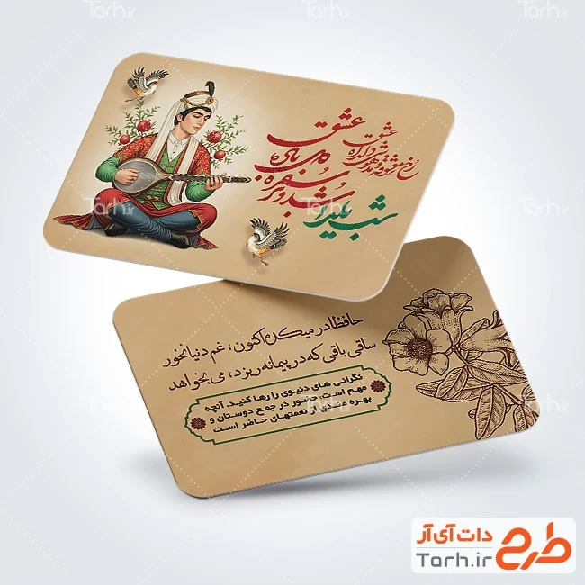 ابعاد طرح دو رو کارت فال حافظ یلدایی در جدول ویژگی های فایل درج شده و با توجه به لایه باز بودن و کیفیت بالای طرح، قابلیت ویرایش و همچنین چاپ بر روی متریالهای مختلف را دارد. طرح گیفت کارت فال حافظ یک نوع طرح دو رو کارت یلدایی است که در جشن شب یلدا میتوانید به مهمانهای خود هدیه دهید و معنی اشعار حافظ را در قالب فال حافظ بخوانید و لذت ببرید. همچنین میتوان طرح برگه فال حافظ یلدا را به جای کارت پستال یلدا هم استفاده کرد.