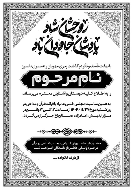طرح خام دعوتنامه ترحیم دارای خوشنویسی روحشان شاد یادشان جاودان باد کد فایل 5863074