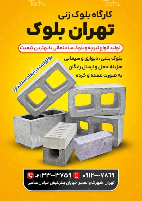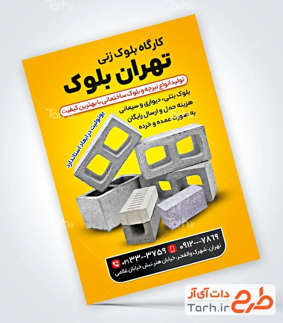 طرح پوستر تبلیغاتی بلوک زنی با فرمت psd و قابل ویرایش در نرمافزار فتوشاپ بهصورت لایه باز توسط تیم طراحان طرح دات آی آر طراحی شده است. در نمونه تراکت بلوک زنی از تصاویر و المانهای باکیفیت و متناسب با استاندارد چاپ استفادهشده، همچنین نکات مهم در طرح تراکت بلوک زنی مانند رنگبندی، رعایت حاشیه، فاصلهها، فضای کافی برای درج متن، سایز و نوع فونت مناسب طراحی تراکت و ... رعایت گردیده است. طرح لایه باز تراکت تیرچه بلوک شامل عکس تیرچه سیمانی میباشد که المانهای استفادهشده در طرح تراکت تیرچه بلوک قابلیت ویرایش، جابهجایی و تغییر سایز را دارا بوده و شما میتوانید متناسب باسلیقه خودتان تراکت لایه باز بلوک زنی را ویرایش نمایید، همچنین با تغییر تصاویر و متنها میتوانید طرح تراکت تیرچه و بلوک را به طرح تراکت کسب و کار مد نظر خود شخصی سازی نمایید.