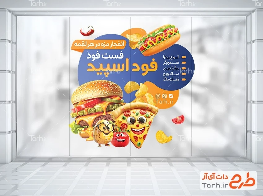 طرح برچسب شیشه فست فود با عکس همبرگر و پیتزا کد فایل 5893741
