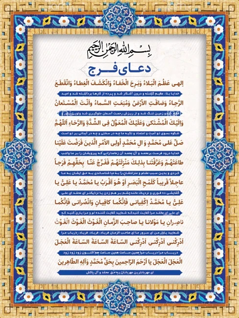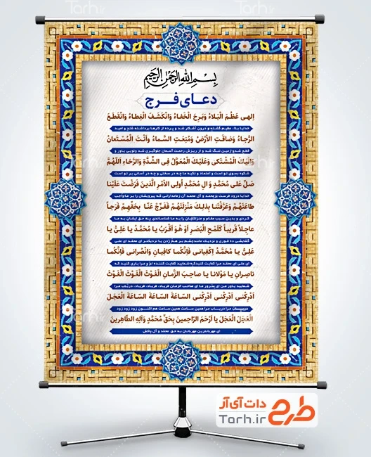 پوستر خام دعای فرج شامل خوشنویسی دعای الهی عظم البلاء و طرح کاشی کاری جهت چاپ بنر دعای الهی عظم البلاء و چاپ بنر دعای فرج امام زمان (عج)