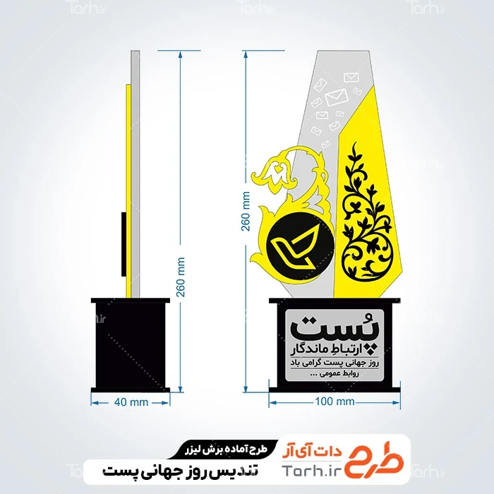دانلود طرح لیزر تندیس روز پست با فرمت PDF ،SVG ، DXF ، CDR ، بر مبنای متریال ام.دی.اف 2.7 میل موجود در بازار ایران، با نرم افزار Corel Draw به صورت لایه باز و قابل ویرایش توسط تیم طراحان طرح دات آی آر طراحی شده است. در طرح آماده برش لیزری استند پست نکات مهم طراحی لیزر مانند رعایت ضخامت چوب، ابعاد روز پست طرح و چیدمان درست برای کمترین پرتی رعایت گردیده است. طرح برش لیزری تندیس روز پست ، آماده اجرا توسط دستگاه های برش، سی ان سی (CNC)، حکاکی لیزر و حکاکی روی چوب میباشد. شما میتوانید از طرح لیزر پست جهت تولید انواع تندیس و استند روز جهانی پست به عنوان هدیه در مراسمات روز جهانی پست استفاده کنید.