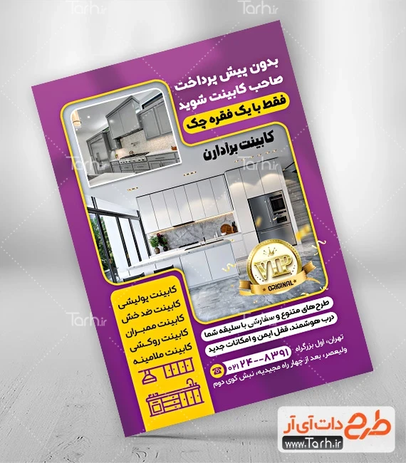 طرح تراکت آماده کارگاه کابینت سازی با رنگبندی بنفش کد فایل 5932148
