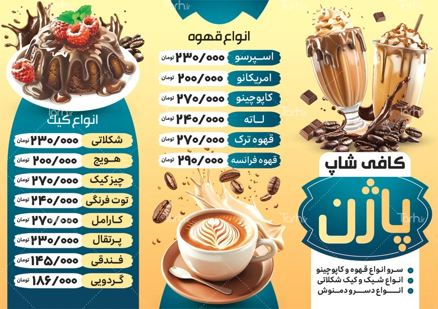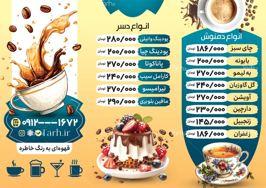 طرح psd بروشور منو کافی شاپ با فرمت psd و قابل ویرایش در نرم افزار فتوشاپ به صورت لایه باز توسط تیم طراحان طرح دات آی آر طراحی شده است. در بروشور لایه باز منو کافه که غالباً در قالب سه و چهار لت (چند لتی) طراحی میشود از تصاویر و المان های با کیفیت و متناسب با استاندارد چاپ استفاده گردیده است. طرح بروشور منو کافی شاپ شامل عکس قهوه، شیک، لاته و لیست قیمت می باشد که المان های استفاده شده در بروشور لایه باز منو کافی شاپ قابلیت حذف، ویرایش، جابه جایی و تغییر سایز را دارا بوده و شما می توانید متناسب با سلیقه خودتان طرح بروشور لیست منو کافی شاپ و کافه را ویرایش نمایید.