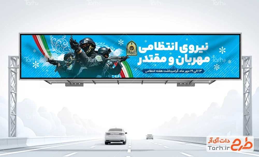 طرح آماده بنر پل عابرپیاده هفته نیروی انتظامی با فرمت psd و قابل ویرایش در نرم افزار فتوشاپ به صورت لایه باز توسط تیم طراحان طرح دات آی آر طراحی شده است. در بنر بیلبورد هفته ی نیروی انتظامی از تصاویر و المان های با کیفیت و متناسب با استاندارد چاپ استفاده گردیده است. بنر تبریک روز نیروی انتظامی شامل عکس پلیس و آرم نیروی انتظامی می باشد که المان های استفاده شده در طرح بنر روز نیروی انتظامی قابلیت ویرایش، جابه جایی و تغییر سایز را دارا بوده و شما می توانید متناسب با سلیقه خودتان طرح لایه باز بنر هفته ی نیروی انتظامی را ویرایش نمایید.
