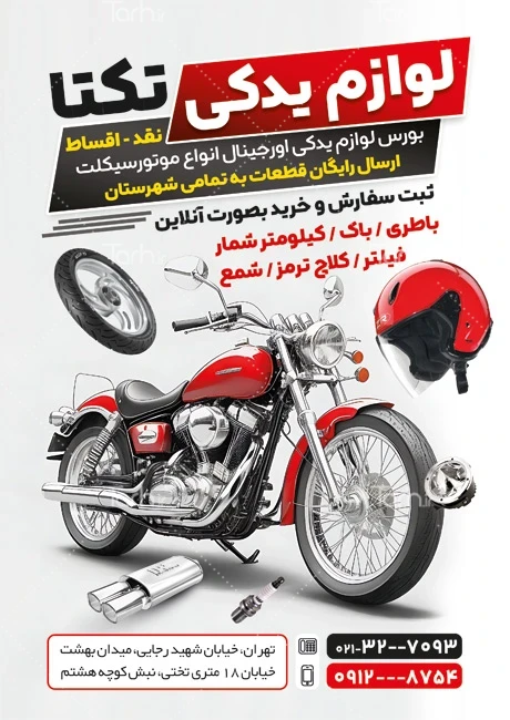 طرح آماده تراکت لوازم یدکی موتور با فرمت psd و قابل ویرایش در نرمافزار فتوشاپ بهصورت لایه باز توسط تیم طراحان طرح دات آی آر طراحی شده است. در نمونه تراکت لوازم یدکی موتورسیکلت از تصاویر و المانهای باکیفیت و متناسب با استاندارد چاپ استفادهشده، همچنین نکات مهم در طرح فروش قطعات یدکی موتور مانند رنگبندی، رعایت حاشیه، فاصلهها، فضای کافی برای درج متن، سایز و نوع فونت مناسب طراحی تراکت و ... رعایت گردیده است. طرح لایه باز تراکت لوازم یدکی موتور سیکلت شامل عکس موتور و قطعات موتور میباشد که المانهای استفادهشده در طرح تراکت لوازم یدکی موتور سیکلت قابلیت ویرایش، جابهجایی و تغییر سایز را دارا بوده و شما میتوانید متناسب باسلیقه خودتان تراکت لایه باز لوازم یدکی موتور سیکلت را ویرایش نمایید، همچنین با تغییر تصاویر و متنها میتوانید طرح تراکت فروش لوازم و قطعات یدکی موتور را به طرح تراکت کسب و کار مد نظر خود شخصی سازی نمایید.
