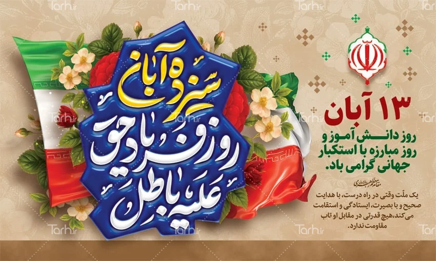 دانلود طرح بنر 13 آبان روز دانش آموز با فرمت psd و قابل ویرایش در نرم افزار فتوشاپ به صورت لایه باز توسط تیم طراحان طرح دات آی آر طراحی شده است. در طرح بنر 13 آبان از تصاویر و المان های با کیفیت و متناسب با استاندارد چاپ استفاده گردیده است. طرح پوستر روز دانش آموز شامل خوشنویسی سیزده آبان روز فریاد حق علیه باطل، وکتور پرچم ایران، وکتور گل و متن سخن رهبری می باشد که المان های استفاده شده در طرح لایه باز بنر روز دانش آموز قابلیت ویرایش، جابه جایی و تغییر سایز را دارا بوده و شما می توانید متناسب با سلیقه خودتان طرح 13 آبان را ویرایش نمایید.