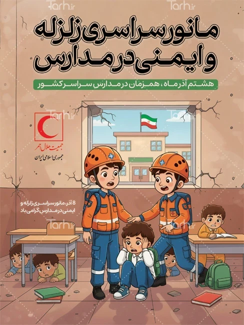 طرح آماده پوستر روز مانور زلزله با فرمت psd و قابل ویرایش در نرم افزار فتوشاپ به صورت لایه باز توسط تیم طراحان طرح دات آی آر طراحی شده است. در طرح بنر مانور زلزله از تصاویر و المان های با کیفیت و متناسب با استاندارد چاپ استفاده گردیده است. طرح پوستر روز مانور زلزله و ایمنی مدارس شامل تصویرسازی دانش آموز پسر و میز مدرسه می باشد که المان های استفاده شده در طرح لایه باز بنر روز مانور زلزله و ایمنی مدارس قابلیت ویرایش، جابه جایی و تغییر سایز را دارا بوده و شما می توانید متناسب با سلیقه خودتان طرح نکات ایمنی زلزله را ویرایش نمایید.