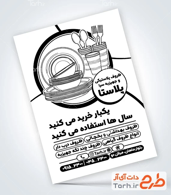 طرح تراکت سیاه و سفید ظروف پلاستیکی جهت چاپ تراکت تک رنگ کد فایل 6104753