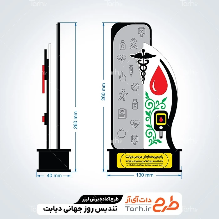 طرح لیزر تندیس روز جهانی دیابت با نرم افزار Corel Draw به صورت لایه باز و قابل ویرایش توسط تیم طراحان طرح دات آی آر طراحی شده است. در طرح آماده برش لیزری استند روز جهانی دیابت نکات مهم طراحی لیزر مانند رعایت ضخامت چوب، ابعاد روز دیابت طرح و چیدمان درست برای کمترین پرتی رعایت گردیده است. طرح برش لیزری تندیس روز دیابت، آماده اجرا توسط دستگاه های برش، سی ان سی (CNC)، حکاکی لیزر و حکاکی روی چوب میباشد. شما میتوانید از طرح لیزر روز دیابت جهت تولید انواع تندیس و استند دیابت به عنوان هدیه در مناسبت روز دیابت استفاده کنید.
