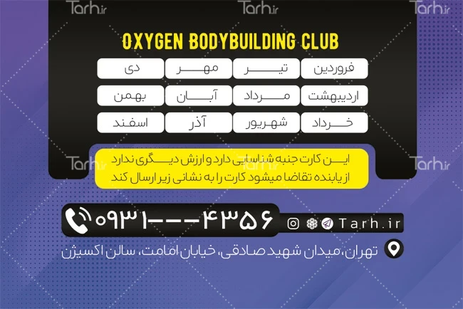 طرح لایه باز کارت عضویت باشگاه بدنسازی با فرمت psd و قابل ویرایش در نرمافزار فتوشاپ بهصورت لایه باز و پشت و رو (دو رو) توسط تیم طراحان طرح دات آی آر طراحی شده است. طرح کارت عضویت باشگاه از تصاویر و المانهای باکیفیت و متناسب با استاندارد چاپ استفادهشده، همچنین نکات مهم در طرح کارت مانند رنگبندی، رعایت حاشیه، فاصلهها، فضای کافی برای درج متن، سایز و نوع فونت مناسب طراحی کارت و ... رعایت گردیده است. نمونه کارت عضویت باشگاه ورزشی شامل عکس ورزشکار و جدول ماه های سال میباشد که المانهای استفادهشده در طرح کارت ویزیت باشگاه ورزشی قابلیت ویرایش، جابهجایی و تغییر سایز را دارا بوده و شما میتوانید متناسب باسلیقه خودتان کارت لایه باز باشگاه بدنسازی را ویرایش نمایید، همچنین با تغییر تصاویر و متنها میتوانید طرح کارت ثبت نام باشگاه بدنسازی را به طرح کارت کسب و کار مد نظر خود شخصی سازی نمایید.