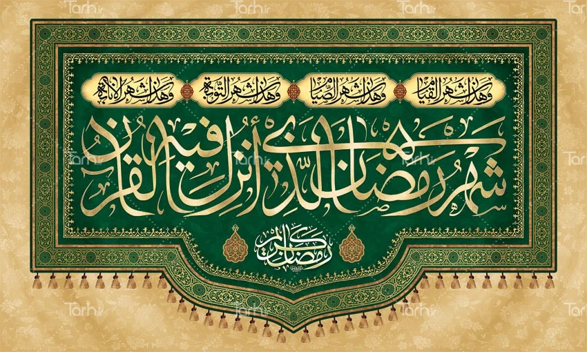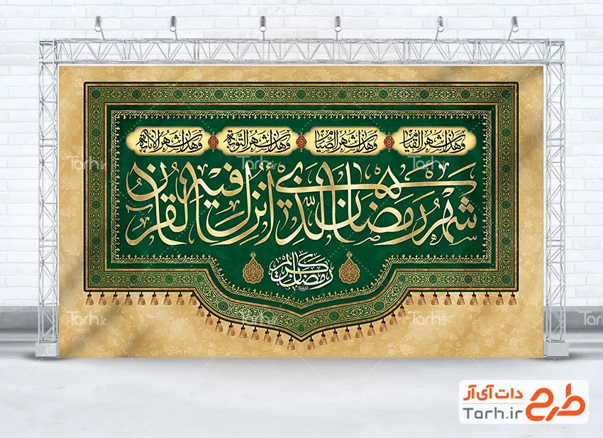 طرح آماده کتیبه پشت منبر ماه رمضان با تایپوگرافی شهر رمضان الذی انزل فیه القرآن کد فایل 6198450
