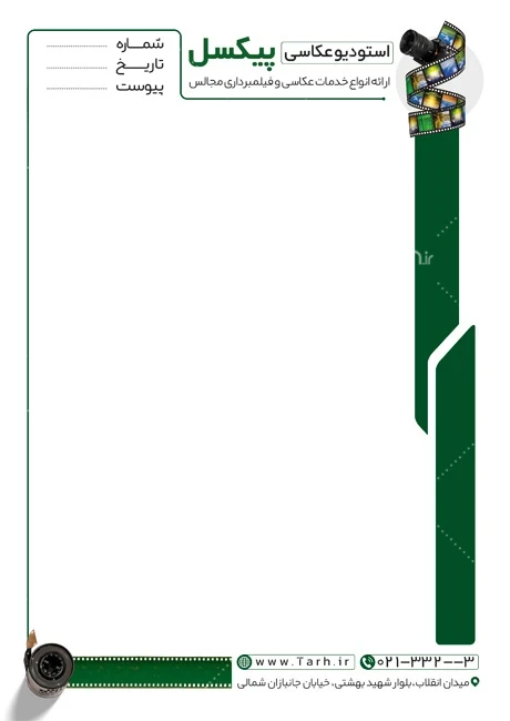 دانلود طرح سربرگ آتلیه فیلمبرداری و عکاسی با فرمت psd و قابل ویرایش در نرمافزار فتوشاپ بهصورت لایه باز توسط تیم طراحان طرح دات آی آر طراحی شده است. در طرح لایه باز سربرگ استودیو عکاسی از المانهای باکیفیت و متناسب با استاندارد چاپ استفادهشده، همچنین نکات مهم در طرح سربرگ خام آتلیه عکاسی مانند رنگبندی، رعایت حاشیه، فاصلهها، فضای کافی برای درج متن، سایز و نوع فونت مناسب طراحی سربرگ و ... رعایت گردیده است. سربرگ لایه باز آتلیه عکاسی شامل لوگو آتلیه عکاسی و محل جایگذاری مشخصات میباشد که المانهای استفادهشده در نمونه سربرگ فروش تجهیزات عکاسی قابلیت ویرایش، جابهجایی و تغییر سایز را دارا بوده و شما میتوانید متناسب باسلیقه خودتان طرح سربرگ استودیو عکاسی را ویرایش نمایید، همچنین با تغییر لوگو و متنها میتوانید طرح سربرگ آتلیه عکاسی را به طرح سربرگ کسب و کار مد نظر خود شخصی سازی نمایید. در اسناد و نامههای اداری و تجاری، سربرگ به عنوان وسیلهای برای نمایش اطلاعاتی مانند نام و لوگو یک شرکت یا سازمان، عنوان سند، تاریخ، شماره صفحه و اطلاعات تماس ( شماره تلفن، آدرس پستی، وبسایت و ایمیل) به کار میرود. این اطلاعات به دریافتکننده کمک میکند تا به راحتی با شرکت یا سازمان تماس بگیرد یا از منابع اطلاعاتی بیشتری بهرهبرداری کند.