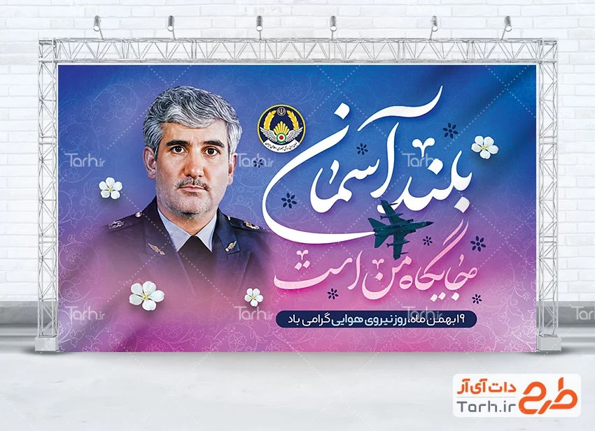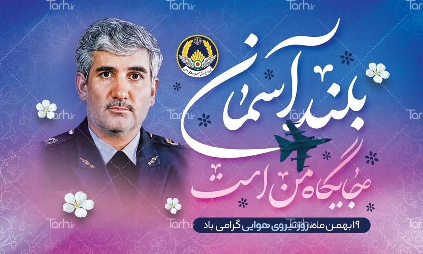 بنر خام روز نیروی هوایی با فرمت psd و قابل ویرایش در نرم افزار فتوشاپ به صورت لایه باز توسط تیم طراحان طرح دات آی آر طراحی شده است. در طرح لایه باز روز ملی نیروی هوایی از تصاویر و المان های با کیفیت و متناسب با استاندارد چاپ استفاده گردیده است. پوستر روز نیروی هوایی شامل خوشنویسی بلند آسمان جایگاه من است، عکس لوگو نیرو هوایی ارتش و عکس شهید خلبان منصور ستاری میباشد که المان های استفاده شده در بنر لایه باز نیروی هوایی ارتش قابلیت ویرایش، جابه جایی و تغییر سایز را دارا بوده و شما می توانید متناسب با سلیقه خودتان طرح بنر روز نیروی هوایی را ویرایش نمایید.