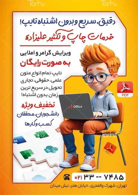 نمونه تراکت تایپ و تکثیر با فرمت psd و قابل ویرایش در نرمافزار فتوشاپ بهصورت لایه باز توسط تیم طراحان طرح دات آی آر طراحی شده است. در فایل تراکت تایپ و تکثیر از تصاویر و المانهای باکیفیت و متناسب با استاندارد چاپ استفادهشده، همچنین نکات مهم در طرح تراکت تایپ و تکثیر مانند رنگبندی، رعایت حاشیه، فاصلهها، فضای کافی برای درج متن، سایز و نوع فونت مناسب طراحی تراکت و ... رعایت گردیده است. طرح لایه باز تراکت دفتر تایپ و تکثیری شامل تصویرسازی پسر میباشد که المانهای استفادهشده در طرح آماده تراکت تایپ و تکثیر قابلیت ویرایش، جابهجایی و تغییر سایز را دارا بوده و شما میتوانید متناسب باسلیقه خودتان تراکت لایه باز خدمات تایپ و تکثیر را ویرایش نمایید، همچنین با تغییر تصاویر و متنها میتوانید دانلود تراکت کپی و پرینت را به طرح تراکت کسب و کار مد نظر خود شخصی سازی نمایید.