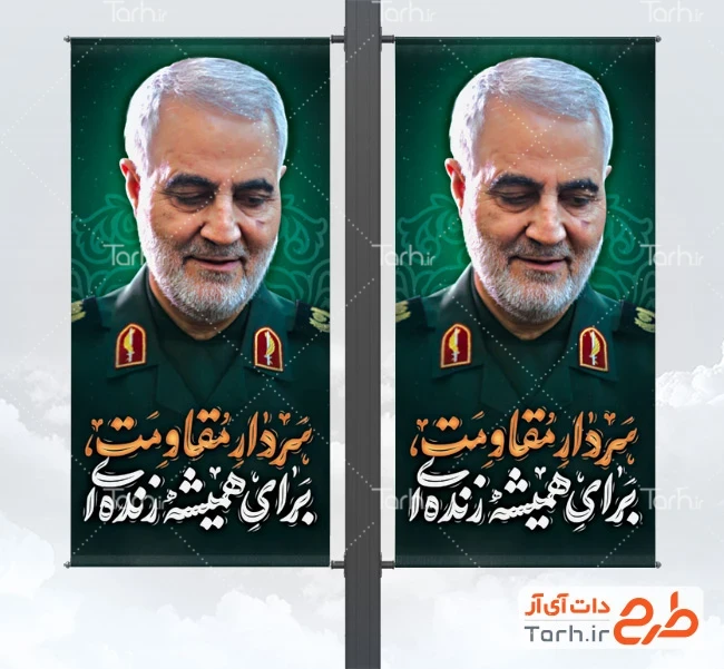 طرح لمپوست سالگرد حاج قاسم با فرمت psd و قابل ویرایش در نرم افزار فتوشاپ به صورت لایه باز توسط تیم طراحان طرح دات آی آر طراحی شده است. در طرح لایه باز شهادت سردار سلیمانی از تصاویر و المان های با کیفیت و متناسب با استاندارد چاپ استفاده گردیده است. طرح استند سردار سلیمانی شامل عکس شهید حاج قاسم سلیمانی و متن سردار مقاومت برای همیشه زنده ای می باشد که المان های استفاده شده در بنر لایه باز شهادت سردار سلیمانی قابلیت ویرایش، جابه جایی و تغییر سایز را دارا بوده و شما می توانید متناسب با سلیقه خودتان طرح بنر ایستاده سالروز شهادت سردار سلیمانی را ویرایش نمایید.