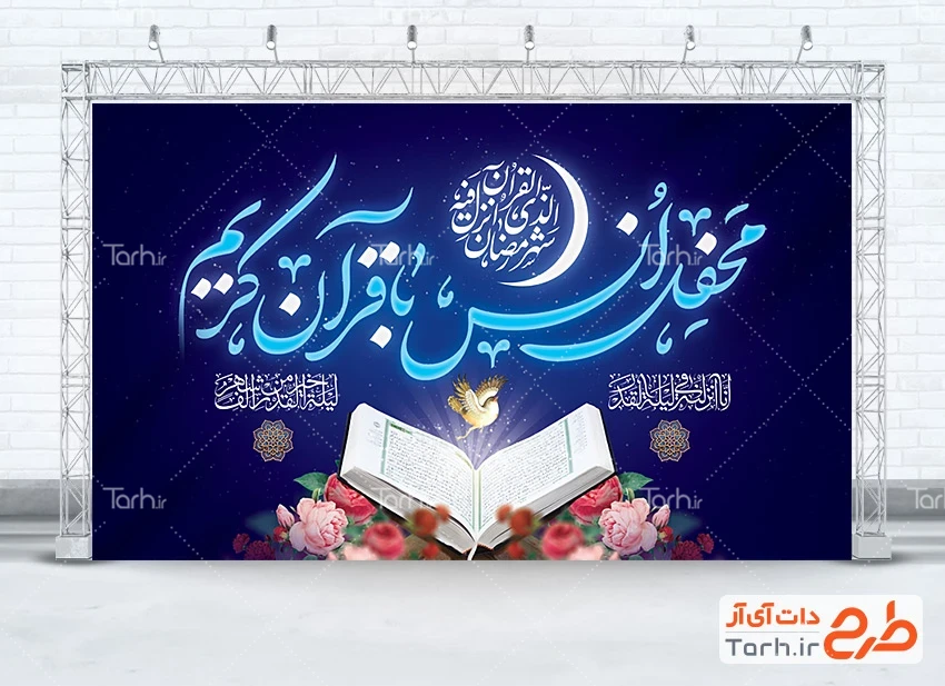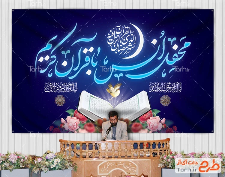 طرح دکور پشت سن محفل انس با قرآن با فرمت psd و قابل ویرایش در نرم افزار فتوشاپ به صورت لایه باز توسط تیم طراحان طرح دات آی آر طراحی شده است. در طرح لایه باز محفل انس با قرآن از تصاویر و المان های با کیفیت و متناسب با استاندارد چاپ استفاده گردیده است. طرح بنر جزء خوانی قرآن شامل خوشنویسی محفل انس با قرآن کریم، خوشنویسی شهر رمضان الذی انزل فیه القرآن، عکس قرآن و وکتور گل می باشد که المان های استفاده شده در طرح بنر پشت مداح مراسم انس با قرآن قابلیت ویرایش، جابه جایی و تغییر سایز را دارا بوده و شما می توانید متناسب با سلیقه خودتان طرح بنر محفل انس با قرآن لایه باز را ویرایش نمایید.