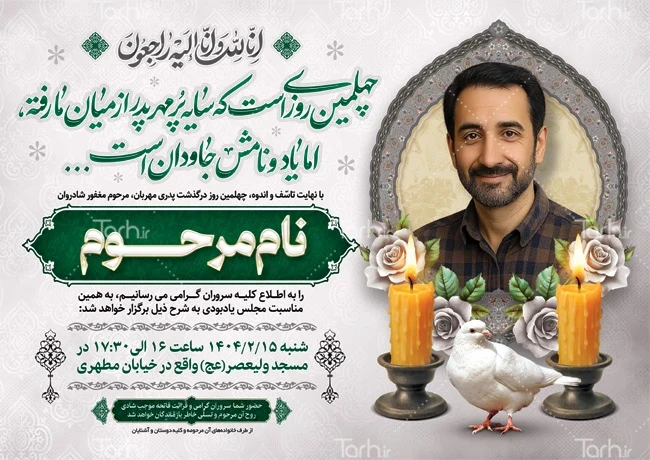 طرح آگهی ترحیم چهلم پدر با فرمت psd و قابل ویرایش در نرمافزار فتوشاپ بهصورت لایه باز توسط تیم طراحان طرح دات آی آر طراحی شده است. در فایل لایه باز اعلامیه ترحیم چهلم پدر از تصاویر و المانهای باکیفیت و متناسب با استاندارد چاپ استفادهشده، همچنین نکات مهم در طرح آگهی ترحیم پدر مانند رنگبندی، رعایت حاشیه، فاصلهها، فضای کافی برای درج متن، سایز و نوع فونت مناسب طراحی آگهی ترحیم و ... رعایت گردیده است. طرح لایه باز آگهی ترحیم پدر شامل با خوشنویسی انا لله و انا الیه راجعون، وکتور گل، شمع و جایگاه عکس مرحوم میباشد که المانهای استفادهشده در آگهی ترحیم لایه باز چهلم پدر قابلیت ویرایش، جابهجایی و تغییر سایز را دارا بوده و شما میتوانید متناسب باسلیقه خودتان نمونه اعلامیه ترحیم پدر را ویرایش نمایید.
