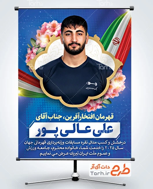 طرح پوستر تبریک مدال نقره علی عالی پور در مسابقات وزنه برداری قهرمانی جهان 2025 نروژ با فرمت psd و قابل ویرایش در نرم افزار فتوشاپ به صورت لایه باز توسط تیم طراحان طرح دات آی آر طراحی شده است. در طرح لایه باز تبریک قهرمانی ورزشی از تصاویر و المان های با کیفیت و متناسب با استاندارد چاپ استفاده گردیده است. طرح بنر تبریک مدال نقره علی عالی پور شامل عکس علی عالی پور، وکتور گل و پرچم ایران می باشد که المان های استفاده شده در بنر لایه باز تبریک قهرمانی علی عالی پور قابلیت ویرایش، جابه جایی و تغییر سایز را دارا بوده و شما می توانید متناسب با سلیقه خودتان پوستر تبریک قهرمانی را ویرایش نمایید.