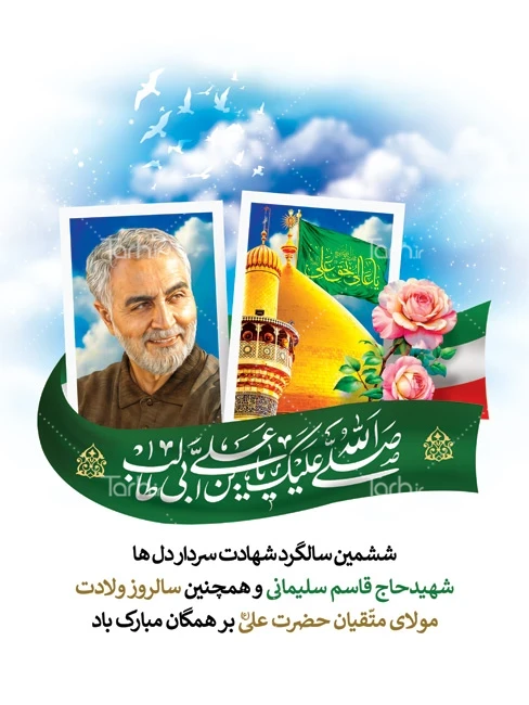 پوستر خام میلاد حضرت علی و سالگرد حاج قاسم سلیمانی با قابلیت ویرایش المان ها کد فایل 6347205