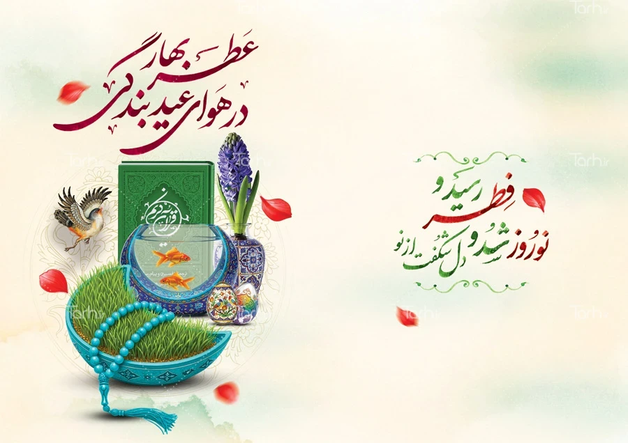 طرح خام کارت پستال عید نوروز و عید فطر با تایپوگرافی عطر بهار در هوای عید بندگی کد فایل 6348179