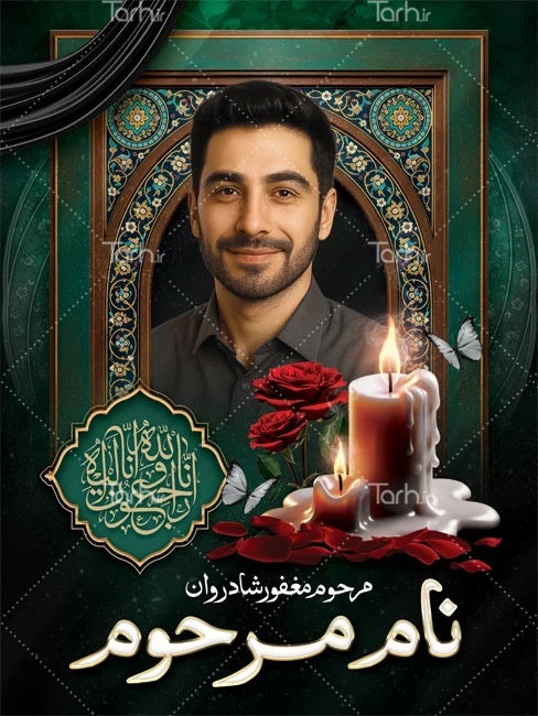 دانلود بنر خام عکس مرحوم با فرمت psd و قابل ویرایش در نرم افزار فتوشاپ به صورت لایه باز توسط تیم طراحان طرح دات آی آر طراحی شده است. در طرح لایه باز عکس مرحوم از تصاویر و المان های با کیفیت و متناسب با استاندارد چاپ استفاده گردیده است. طرح بنر عکس مرحوم شامل محل جایگذاری عکس مرحوم، وکتور شمع و گل و پروانه و خوشنویسی انا لله و انا الیه راجعون می باشد که المان های استفاده شده در بنر تصویر مرحوم قابلیت ویرایش، جابه جایی و تغییر سایز را دارا بوده و شما می توانید متناسب با سلیقه خودتان طرح بنر ترحیم و تصویر مرحوم را ویرایش نمایید.
