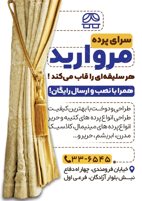طرح psd تراکت فروشگاه پرده با فرمت psd و قابل ویرایش در نرمافزار فتوشاپ بهصورت لایه باز توسط تیم طراحان طرح دات آی آر طراحی شده است. در نمونه تراکت پرده سرا از تصاویر و المانهای باکیفیت و متناسب با استاندارد چاپ استفادهشده، همچنین نکات مهم در طرح تراکت پرده سرا مانند رنگبندی، رعایت حاشیه، فاصلهها، فضای کافی برای درج متن، سایز و نوع فونت مناسب طراحی تراکت و ... رعایت گردیده است. طرح لایه باز تراکت فروشگاه پرده شامل عکس پرده میباشد که المانهای استفادهشده در طرح تراکت فروشگاه پرده قابلیت ویرایش، جابهجایی و تغییر سایز را دارا بوده و شما میتوانید متناسب باسلیقه خودتان نمونه تراکت پرده فروشی را ویرایش نمایید، همچنین با تغییر تصاویر و متنها میتوانید دانلود تراکت پرده سرا را به طرح تراکت کسب و کار مد نظر خود شخصی سازی نمایید.