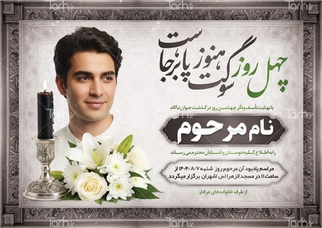 فایل لایه باز آگهی ترحیم چهلم جوان با محل جایگذاری عکس مرحوم کد فایل 6402793