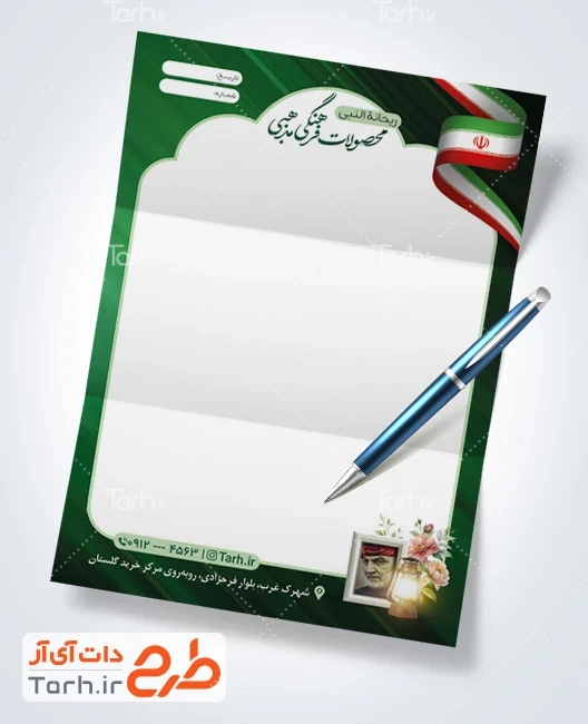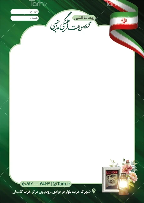 طرح سربرگ خام فروشگاه محصولات فرهنگی مذهبی دارای قاب عکس سردار سلیمانی کد فایل 6432918