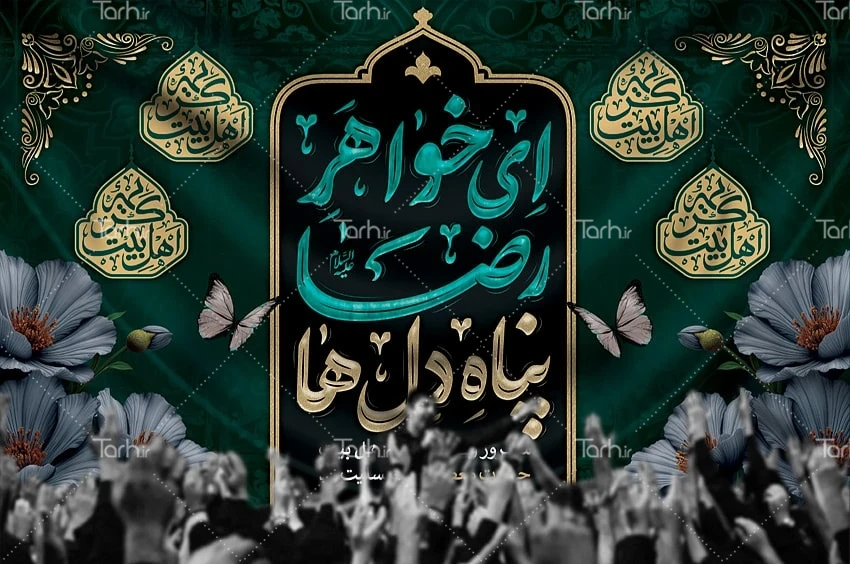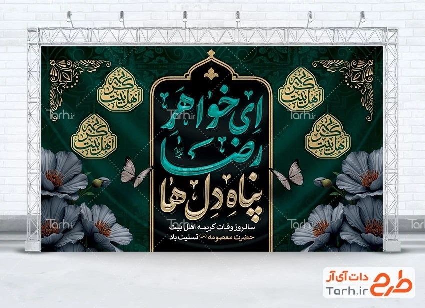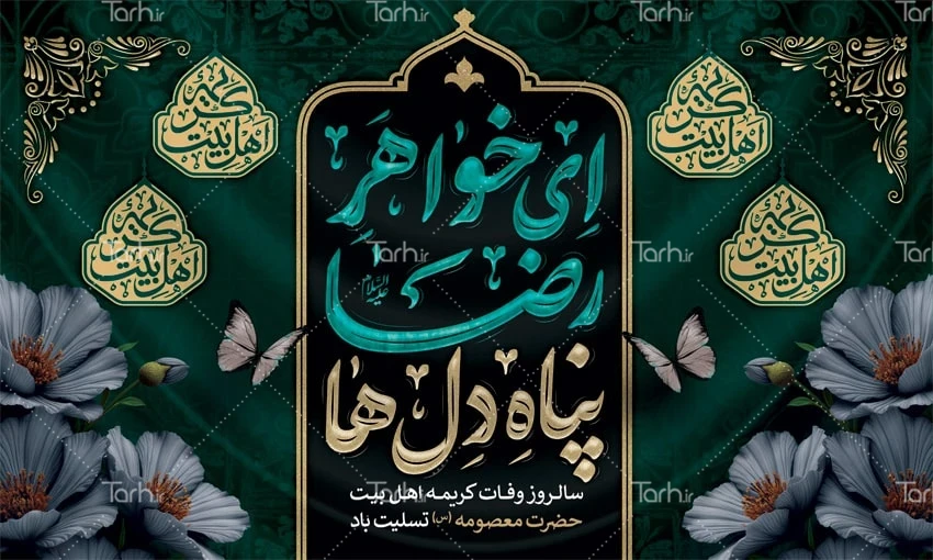 طرح بنر جایگاه وفات حضرت معصومه با فرمت psd و قابل ویرایش در نرم افزار فتوشاپ به صورت لایه باز توسط تیم طراحان طرح دات آی آر طراحی شده است. در پشت منبری لایه باز وفات حضرت معصومه از تصاویر و المان های با کیفیت و متناسب با استاندارد چاپ استفاده گردیده است. طرح بنر پشت منبری وفات حضرت معصومه شامل تایپوگرافی ای خواهر رضا پناه دل ها و خوشنویسی کریمه اهل بیت می باشد که المان های استفاده شده در طرح بنر لایه باز رحلت حضرت معصومه قابلیت ویرایش، جابه جایی و تغییر سایز را دارا بوده و شما می توانید متناسب با سلیقه خودتان طرح بنر جایگاه رحلت حضرت معصومه را ویرایش نمایید.