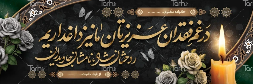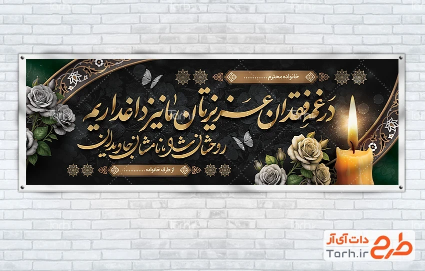 طرح خام پلاکارد تسلیت با فرمت psd و قابل ویرایش در نرم افزار فتوشاپ به صورت لایه باز توسط تیم طراحان طرح دات آی آر طراحی شده است. در طرح لایه باز بنر تسلیت از تصاویر و المان های با کیفیت و متناسب با استاندارد چاپ استفاده گردیده است. طرح بنر تسلیت شامل خوشنویسی در غم فقدان عزیزتان ما نیز داغداریم، طرح اسلیمی، عکس گل و عکس شمع می باشد که المان های استفاده شده در بنر لایه باز تسلیت قابلیت ویرایش، جابه جایی و تغییر سایز را دارا بوده و شما می توانید متناسب با سلیقه خودتان طرح عرض تسلیت را ویرایش نمایید.