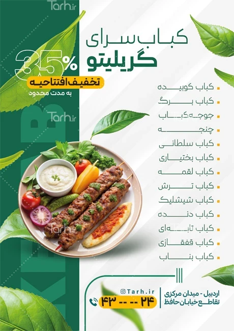 فایل لایه باز تراکت کبابسرا با فرمت psd و قابل ویرایش در نرمافزار فتوشاپ بهصورت لایه باز توسط تیم طراحان طرح دات آی آر طراحی شده است. در نمونه تراکت کبابی از تصاویر و المانهای باکیفیت و متناسب با استاندارد چاپ استفادهشده، همچنین نکات مهم در تراکت رستوران سنتی لایه باز مانند رنگبندی، رعایت حاشیه، فاصلهها، فضای کافی برای درج متن، سایز و نوع فونت مناسب طراحی تراکت و ... رعایت گردیده است. طرح لایه باز پوستر رستوران شامل عکس غذای ایرانی و متن تبلیغ رستوران میباشد که المانهای استفادهشده در طرح پوستر تبلیغاتی رستوران قابلیت ویرایش، جابهجایی و تغییر سایز را دارا بوده و شما میتوانید متناسب باسلیقه خودتان طرح لایه باز تراکت کبابسرا را ویرایش نمایید، همچنین با تغییر تصاویر و متنها میتوانید طرح تراکت رستوران و کبابی را به طرح تراکت کسب و کار مد نظر خود شخصی سازی نمایید.