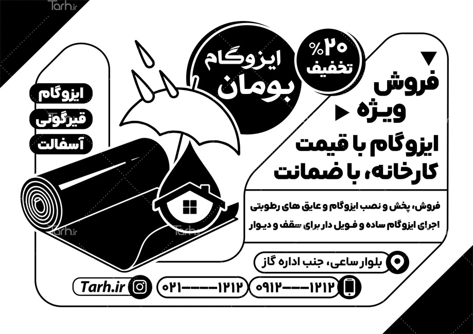ابعاد تراکت تبلیغاتی سیاه و سفید ایزوگام در جدول ویژگیهای فایل درجشده و با توجه به لایه باز بودن و کیفیت بالای طرح تراکت ریسو خدمات نصب ایزوگام، قابلیت ویرایش و تبدیل به سایز دلخواه، همچنین چاپ روی متریالهای مختلف مانند انواع کاغذ، گلاسه، کاغذ الوان و ... را دارا میباشد. همچنین میتوان طرح سیاه سفید ایزوگام را در زمینه های چاپ سیلک ، نایلون، ساک دستی، پاکت دستی و کیسه نیز استفاده کرد. تراکت های سیاه سفید یا ریسو یک ابزار تبلیغاتی بسیار موثر محسوب می شوند و به دلیل هزینه کم و تأثیر بالا، در بسیاری از کسب و کارها به عنوان روشی اقتصادی و موثر برای انتقال اطلاعات به مخاطبان برای تبلیغات و رویدادهای مختلف استفاده میشوند.