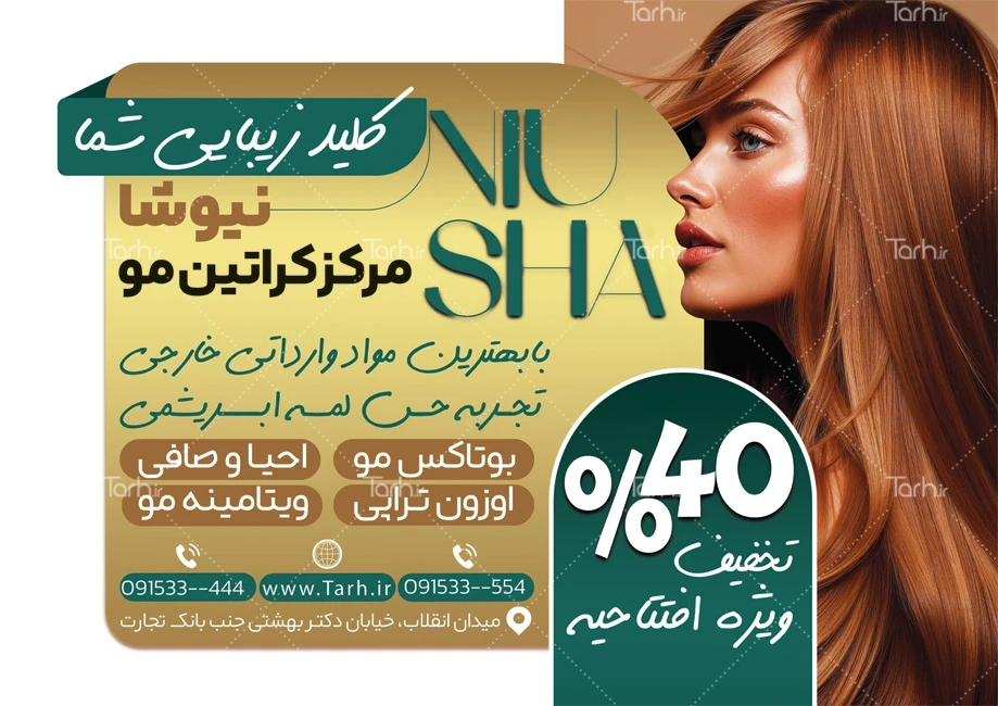 طرح آماده تراکت کراتین مو با فرمت psd و قابل ویرایش در نرمافزار فتوشاپ بهصورت لایه باز توسط تیم طراحان طرح دات آی آر طراحی شده است. در نمونه تراکت مرکز تخصصی کراتین مو از تصاویر و المانهای باکیفیت و متناسب با استاندارد چاپ استفادهشده، همچنین نکات مهم در تراکت لایه باز کراتین مو مانند رنگ بندی، رعایت حاشیه، فاصلهها، فضای کافی برای درج متن، سایز و نوع فونت مناسب طراحی تراکت و ... رعایت گردیده است. طرح لایه باز تراکت کراتین و احیای مو شامل عکس مدل مو میباشد که المانهای استفادهشده در طرح تراکت آرایشگاه زنانه قابلیت ویرایش، جابهجایی و تغییر سایز را دارا بوده و شما میتوانید متناسب باسلیقه خودتان طرح تراکت کراتین مو را ویرایش نمایید، همچنین با تغییر تصاویر و متنها میتوانید تراکت لایه باز کراتین صافی مو و رنگ مو را به طرح تراکت کسب و کار مد نظر خود شخصی سازی نمایید.