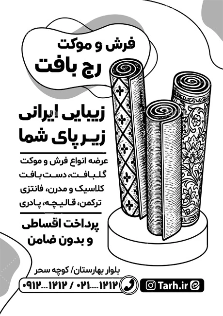 ابعاد تراکت تبلیغاتی سیاه و سفید فرش و موکت در جدول ویژگیهای فایل درجشده و با توجه به لایه باز بودن و کیفیت بالای طرح تراکت ریسو فرش فروشی، قابلیت ویرایش و تبدیل به سایز دلخواه، همچنین چاپ روی متریالهای مختلف مانند انواع کاغذ، گلاسه، کاغذ الوان و ... را دارا میباشد. همچنین میتوان طرح سیاه سفید قالی فروشی را در زمینه های چاپ سیلک ، نایلون، ساک دستی، پاکت دستی و کیسه نیز استفاده کرد. تراکت های سیاه سفید یا ریسو یک ابزار تبلیغاتی بسیار موثر محسوب می شوند و به دلیل هزینه کم و تأثیر بالا، در بسیاری از کسب و کارها به عنوان روشی اقتصادی و موثر برای انتقال اطلاعات به مخاطبان برای تبلیغات و رویدادهای مختلف استفاده میشوند.