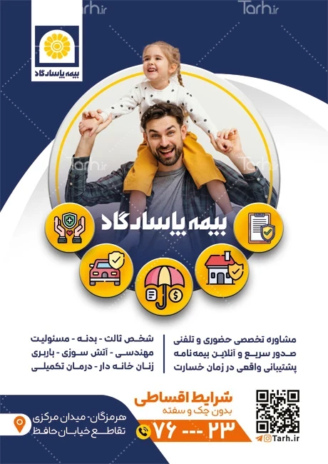 پوستر تبلیغاتی دفتر بیمه پاسارگاد با فرمت psd و قابل ویرایش در نرمافزار فتوشاپ بهصورت لایه باز توسط تیم طراحان طرح دات آی آر طراحی شده است. در نمونه تراکت بیمه پاسارگاد از تصاویر و المانهای باکیفیت و متناسب با استاندارد چاپ استفادهشده، همچنین نکات مهم در طرح تراکت بیمه پاسارگاد مانند رنگبندی، رعایت حاشیه، فاصلهها، فضای کافی برای درج متن، سایز و نوع فونت مناسب طراحی تراکت و ... رعایت گردیده است. طرح لایه باز تراکت نمایندگی بیمه شامل لوگو بیمه پاسارگاد و عکس پدر و دختر میباشد که المانهای استفادهشده در دانلود تراکت لایه باز بیمه پاسارگاد قابلیت ویرایش، جابهجایی و تغییر سایز را دارا بوده و شما میتوانید متناسب باسلیقه خودتان تراکت لایه باز بیمه پاسارگاد را ویرایش نمایید، همچنین با تغییر تصاویر و متنها میتوانید طرح تراکت نمایندگی بیمه پاسارگاد را به طرح تراکت کسب و کار مد نظر خود شخصی سازی نمایید.