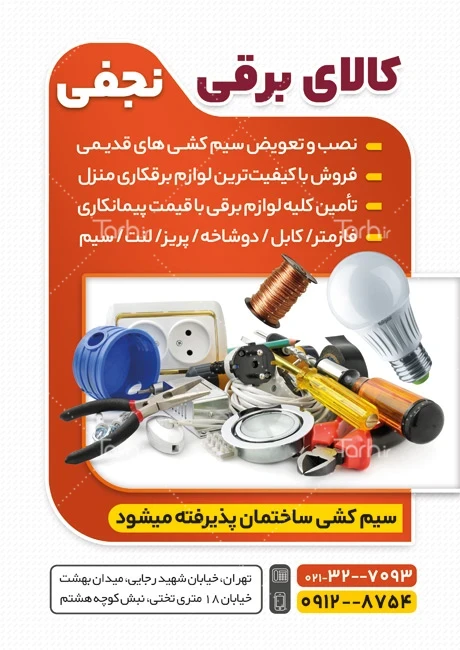نمونه تراکت آماده فروش لوازم برق و الکتریکی با قابلیت ویرایش المان ها کد فایل 6571428