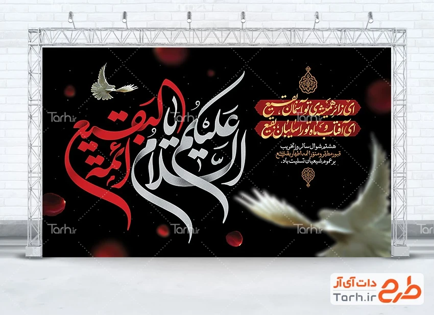 طرح بنر پشت منبر بقیع با خوشنویسی اختصاصی السلام علیکم یا ائمه البقیع کد فایل 6573498
