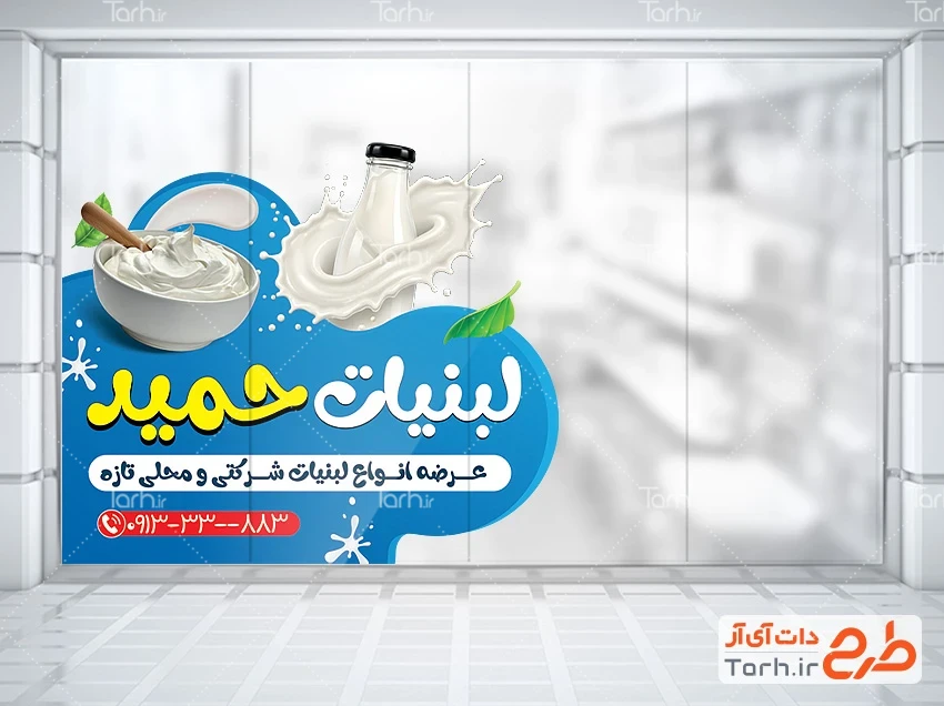 طرح آماده استیکر روی شیشه سوپر لبنیاتی دارای تصویرسازی شیر و ماست کد فایل 6719502