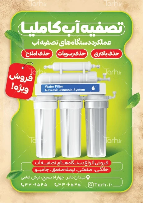 تراکت خام لایه باز دستگاه تصفیه آب با فرمت psd و قابل ویرایش در نرمافزار فتوشاپ بهصورت لایه باز توسط تیم طراحان طرح دات آی آر طراحی شده است. در نمونه تراکت تصفیه آب از تصاویر و المانهای باکیفیت و متناسب با استاندارد چاپ استفادهشده، همچنین نکات مهم در دانلود تراکت دستگاه تصفیه آب مانند رنگبندی، رعایت حاشیه، فاصلهها، فضای کافی برای درج متن، سایز و نوع فونت مناسب طراحی تراکت و ... رعایت گردیده است. طرح لایه باز تراکت فروشگاه دستگاه تصفیه آب شامل عکس دستگاه تصفیه آب میباشد که المانهای استفادهشده در طرح تراکت فروشگاه دستگاه تصفیه آب قابلیت ویرایش، جابهجایی و تغییر سایز را دارا بوده و شما میتوانید متناسب باسلیقه خودتان تراکت دستگاه تصفیه آب را ویرایش نمایید، همچنین با تغییر تصاویر و متنها میتوانید طرح تراکت تصفیه آب را به طرح تراکت کسب و کار مد نظر خود شخصی سازی نمایید.
