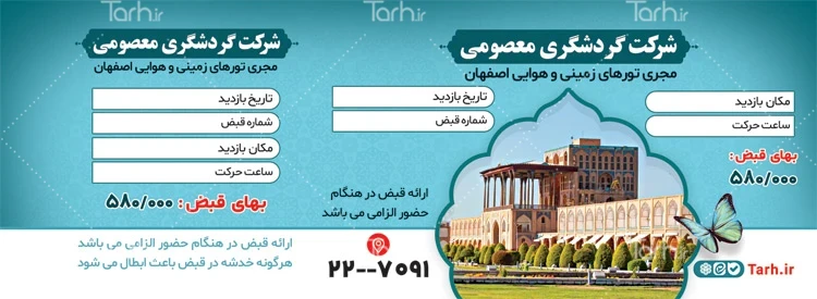 فایل رسید مکان های دیدنی اصفهان با فرمت psd و قابل ویرایش در نرمافزار فتوشاپ بهصورت لایه باز توسط تیم طراحان طرح دات آی آر طراحی شده است. در نمونه قبض شرکت از تصاویر و المانهای باکیفیت و متناسب با استاندارد چاپ استفادهشده، همچنین نکات مهم در طرح قبض رسید مکان های گردشگری مانند رنگبندی، رعایت حاشیه، فاصلهها، فضای کافی برای درج متن، سایز و نوع فونت مناسب قبض سی و سه پل خام و ... رعایت گردیده است. طرح لایه باز قبض مکانهای گردشگری شامل عکس عمارت عالی قاپو میباشد که المانهای استفادهشده در فرم خام قبض گردشگری قابلیت ویرایش، جابهجایی و تغییر سایز را دارا بوده و شما میتوانید متناسب باسلیقه خودتان قبض لایه باز گردشگری را ویرایش نمایید، همچنین با تغییر تصاویر و متنها میتوانید طرح قبض گردشگری لایه باز را به طرح قبض کسب و کار مد نظر خود شخصی سازی نمایید.