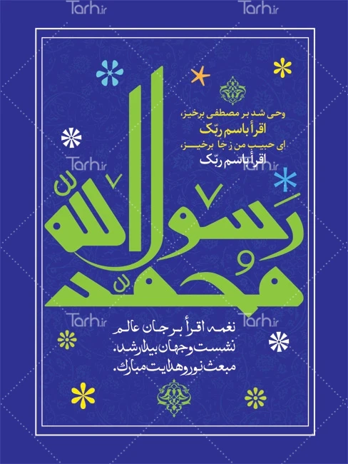 بنر لایه باز عید مبعث با فرمت psd و قابل ویرایش در نرم افزار فتوشاپ به صورت لایه باز توسط تیم طراحان طرح دات آی آر طراحی شده است. در طرح لایه باز عید مبعث از تصاویر و المان های با کیفیت و متناسب با استاندارد چاپ استفاده گردیده است. بنر لایه باز عید سعید مبعث شامل تایپوگرافی محمد رسول الله و وکتور گل میباشد که المان های استفاده شده در طرح پوستر تبریک عید مبعث قابلیت ویرایش، جابه جایی و تغییر سایز را دارا بوده و شما می توانید متناسب با سلیقه خودتان طرح بنر بعثت رسول اکرم را ویرایش نمایید.