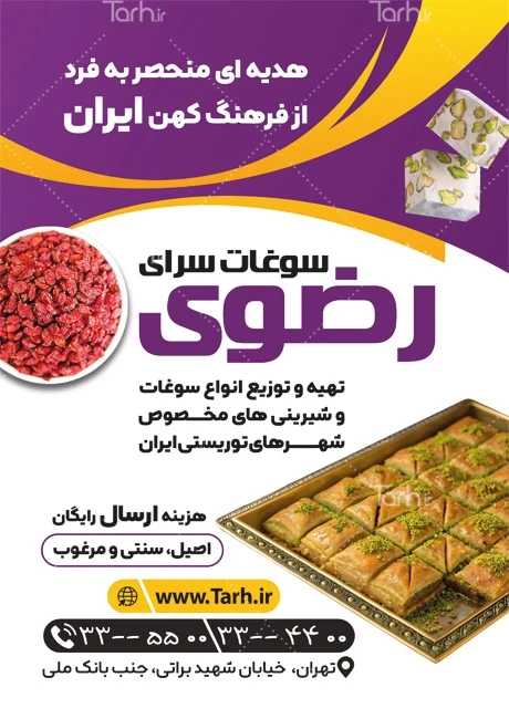 طرح پوستر فروشگاه سوغات با فرمت psd و قابل ویرایش در نرمافزار فتوشاپ بهصورت لایه باز توسط تیم طراحان طرح دات آی آر طراحی شده است. در نمونه تراکت سوغات فروشی از تصاویر و المانهای باکیفیت و متناسب با استاندارد چاپ استفادهشده، همچنین نکات مهم در طرح تراکت سوغات سرا مانند رنگبندی، رعایت حاشیه، فاصلهها، فضای کافی برای درج متن، سایز و نوع فونت مناسب طراحی تراکت و ... رعایت گردیده است. طرح لایه باز تراکت سوغات شامل عکس شیرینی میباشد که المانهای استفادهشده در طرح تراکت سوغات سرا قابلیت ویرایش، جابهجایی و تغییر سایز را دارا بوده و شما میتوانید متناسب باسلیقه خودتان تراکت لایه باز سوغات سرا را ویرایش نمایید، همچنین با تغییر تصاویر و متنها میتوانید طرح تراکت صنایع دستی را به طرح تراکت کسب و کار مد نظر خود شخصی سازی نمایید.
