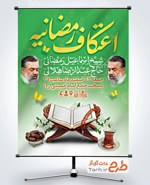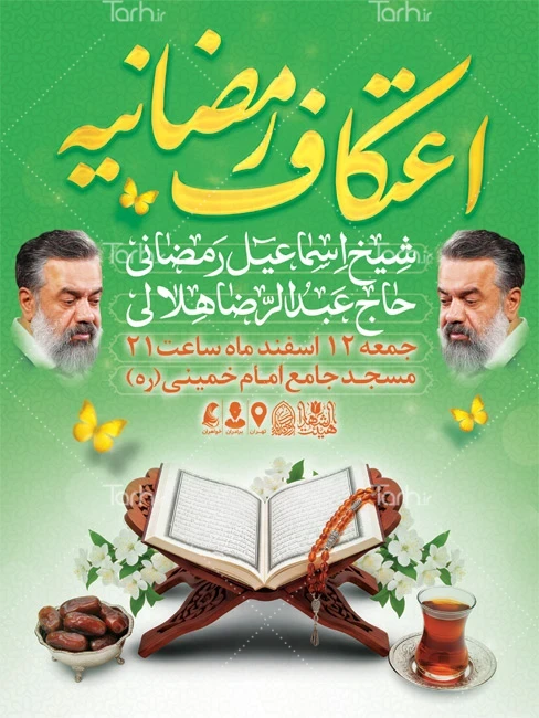 طرح پوستر اطلاعیه مراسم اعتکاف رمضان با عکس و اسم مداح و سخنران کد فایل 6823470