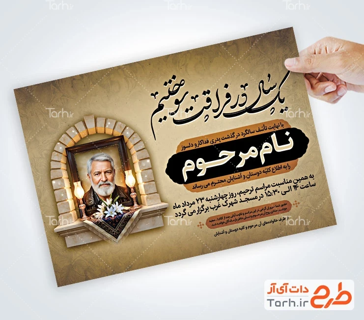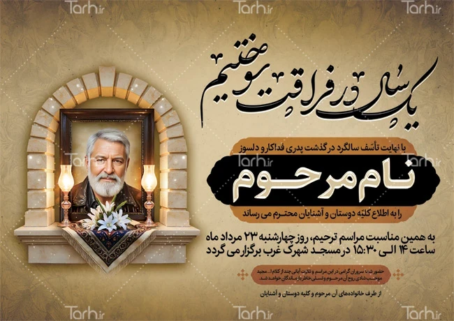 نمونه اعلامیه ترحیم سالگرد پدر با فرمت psd و قابل ویرایش در نرمافزار فتوشاپ بهصورت لایه باز توسط تیم طراحان طرح دات آی آر طراحی شده است. در فایل لایه باز اعلامیه ترحیم پدر از تصاویر و المانهای باکیفیت و متناسب با استاندارد چاپ استفادهشده، همچنین نکات مهم در طرح آگهی ترحیم پدر مانند رنگبندی، رعایت حاشیه، فاصلهها، فضای کافی برای درج متن، سایز و نوع فونت مناسب طراحی آگهی ترحیم و ... رعایت گردیده است. طرح خام آگهی ترحیم پدر شامل خوشنویسی یک سال در فراقت سوختیم، وکتور گل و شمع میباشد که المانهای استفادهشده در آگهی ترحیم لایه باز پدر قابلیت ویرایش، جابهجایی و تغییر سایز را دارا بوده و شما میتوانید متناسب باسلیقه خودتان نمونه اعلامیه ترحیم پدر را ویرایش نمایید.